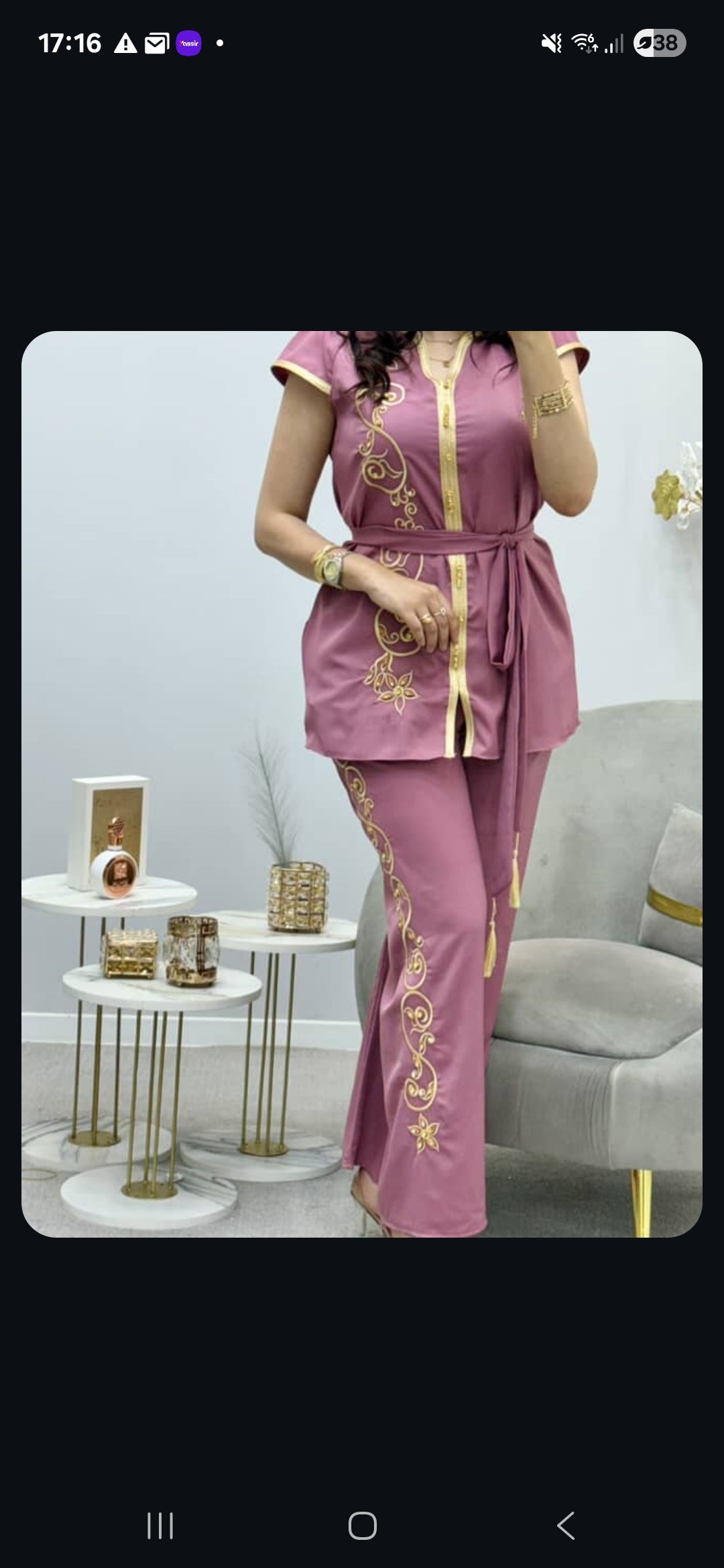 élégance et confort en un seul ensemble ,cet ensemble deux pièces marron excite on rose est sublimé par une délicate broderies dorées qui apporte une touche raffinée et lumineuse